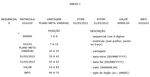 Art. 12 Com base nas informações contidas no arquivo, as GRH setoriais elaborarão os cálculos da parcela variável prevista no Inciso II do art.º 7 do Decreto nº 33.887/11, obedecendo aos critérios estabelecidos pelo titular da Pasta, devendo devolver a A/CSRH, com o layout definido no Anexo I do presente Decreto, para o processamento em folha de pagamento até o dia 13/02/2012.