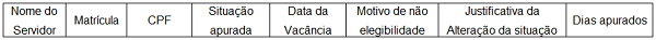 II – No caso de servidores “Não Elegíveis” haverá informações nos campos “Data da Vacância” e/ou “Motivo da Não Elegibilidade”, de acordo com os dados cadastrados no sistema ERGON.